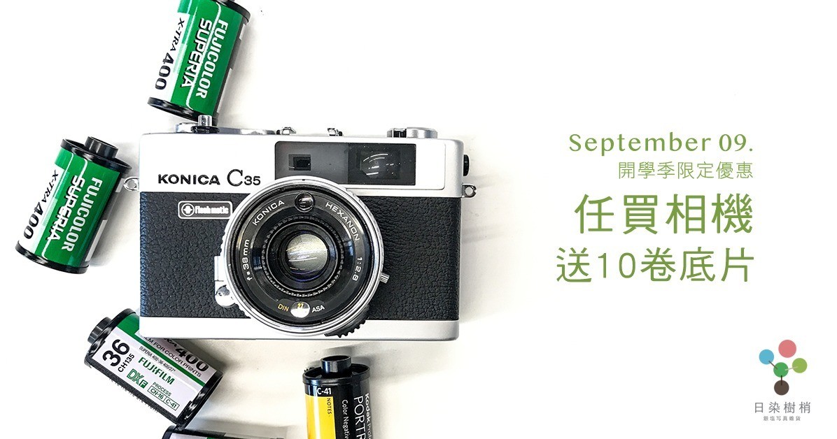 9月開學季,趕快準備好相機記錄校園生活!日染樹梢推出本月限定超佛心活動!本優惠非常適合推薦給準備購買底片相機的初學者,想學好攝影就是要大量練習拍照唷!